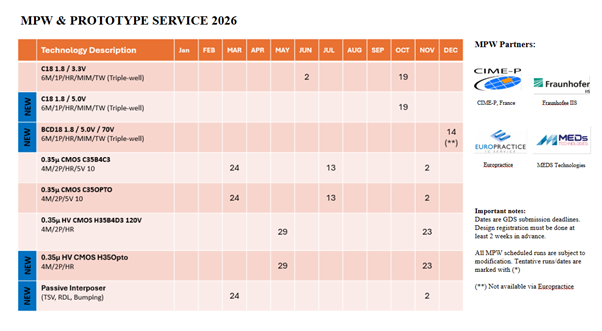 The MPW program also continues to offer proven technologies such as 350nm CMOS, CMOS high-voltage and embedded‑flash options, giving designers flexibility across many application areas.