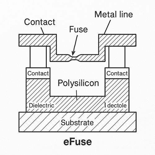 Electronics fuse (eFuse) memories apply an electronic fuse structure for one-time programmable services, unlike OTP which uses a conventional anti-fuse structure. The memory cell of eFuse comprises a polysilicon resistor that will break permanently by electro-migration techniques. One-time programming can be done by applying a high current through a physically break polysilicon fuse that alters the cell’s resistance state, which is a non-reversible open circuit and makes the eFuse an OTP.